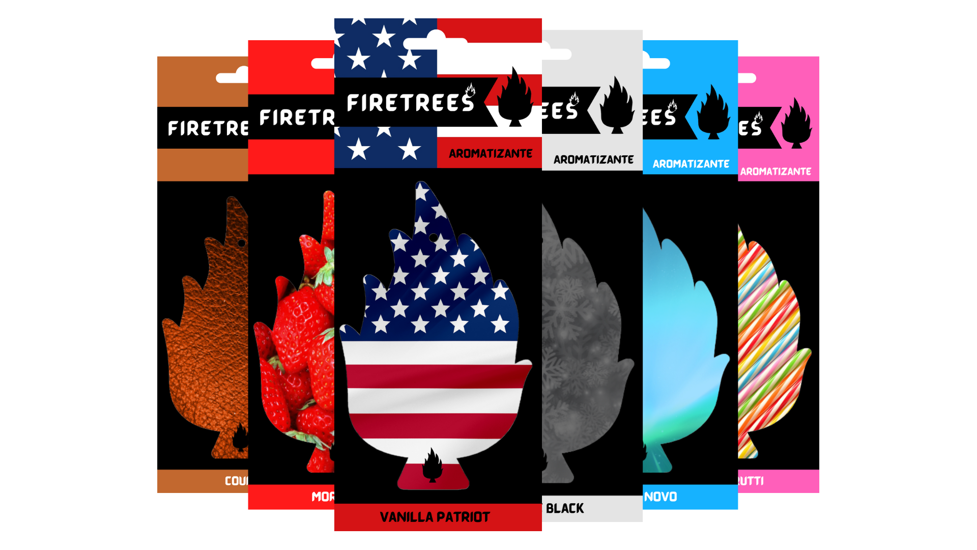 Aromatizantes Firetrees com fragrâncias Tutti-Frutti, Carro Novo, Morango, Couro, Freeze Black e Vanilla Patriot, garantindo frescor, aroma e bem-estar.